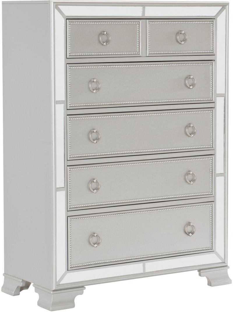 Silver finished drop pull hardware centers each bead-molding adorned drawer front.