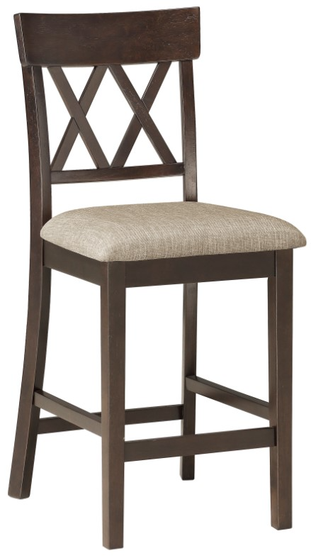 The double X-back chair features brown linen-like fabric that covers the padded seat. The mindy veneer of the chair is finished in dark brown for neutral accent to your casual dining space.