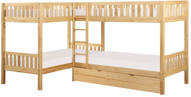 This transitional corner bunkbed is featured in a natural pine finish making it an appropriate choice for a number of youth bedroom settings. The four twin beds that comprise the unit conjoin to fit perfectly within your available space.Read More