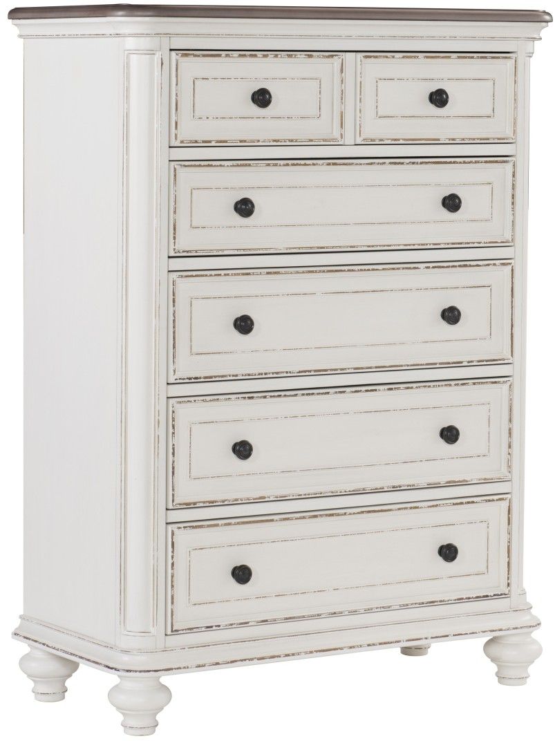 Soft, sweeping curves define the elegant profile of the Baylesford Collection. The chest is softened by an antique white rub-through finish with a brown- gray finished framed-plank top, creating a romantic aesthetic will place beautifully within your bedroom. Dark finished metal knob hardware provides complementing contrast to the drawer fronts.