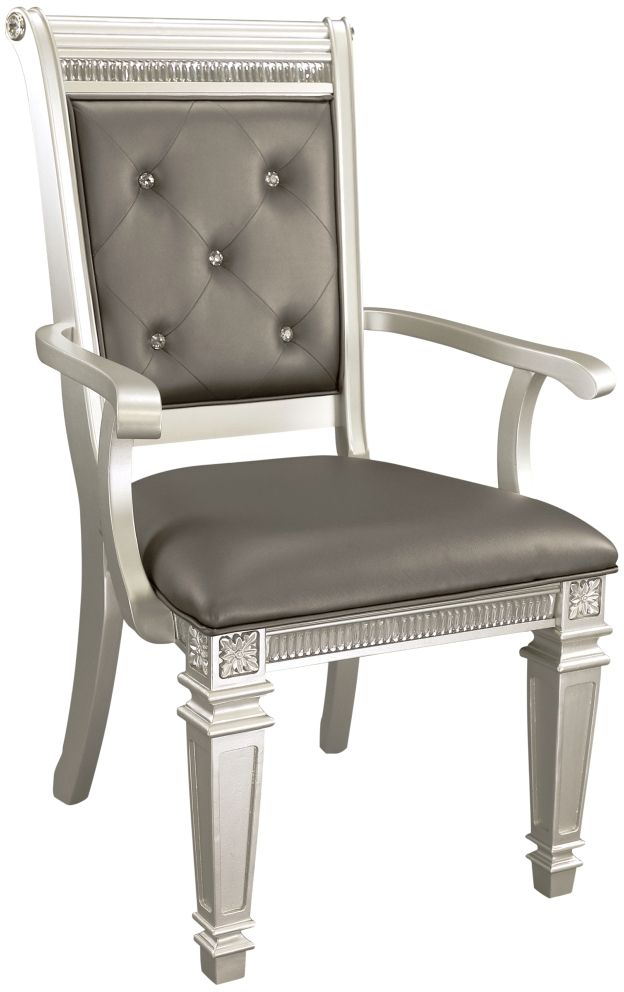 Modern glamour is exemplified in the design of the Bevelle collection. The dark gray faux leather of the dining arm chairs provides contrast to the coordinating silver finish dining table.Read More