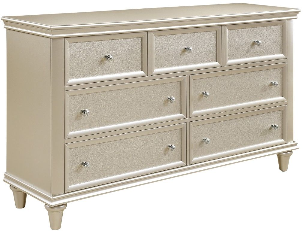 The look of traditional design is updated for the modern traditional home in the Celandine collection. The high polished knob hardware stands out from the silver finish of the dresser. With each of the aforementioned elements, subtle glamour will be achieved in the design of your elegant bedroom.Read More