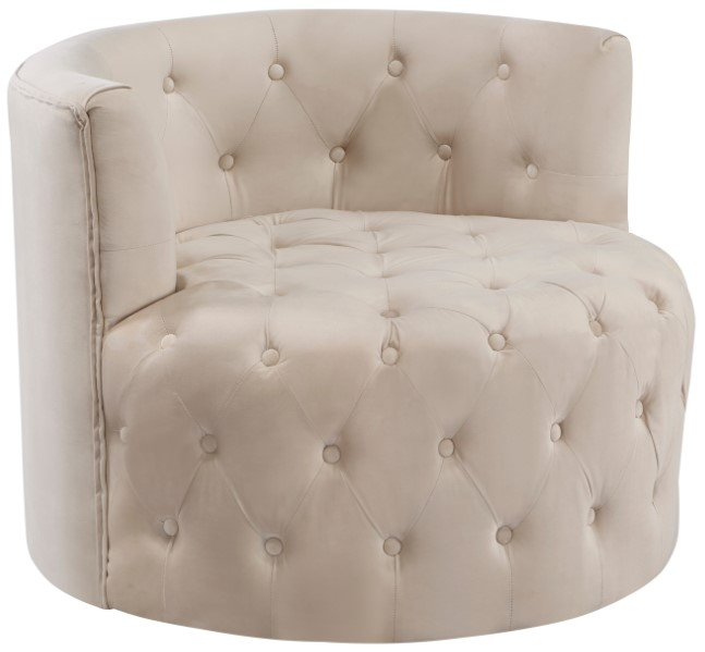 Lending a decorative glamorous touch to your home’s décor is the Cheswold Collection. The enveloping barrel-back 360-degree swivel chair allows you to engage with your surroundings. Button-tufting and a lush beige velvet cover further the elegant design.Read More