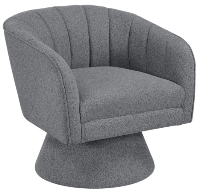 The distinctive channel-stitched chair back not only adds a sophisticated design element but also provides excellent lumbar support. Built on a durable solid wood and plywood frame with a robust metal swivel base, this chair boasts a full 360-degree swivel, allowing you to effortlessly pivot and engage with your surroundings. Whether used as a stylish focal point in your living room, a comfortable reading chair in your bedroom, or an elegant addition to your office, this chair delivers both aesthetic appeal and practical versatility.
