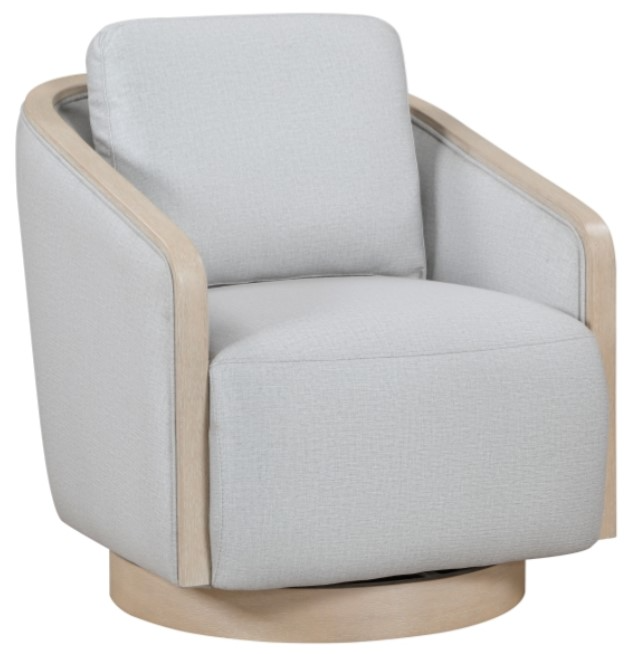 Elevate your living space with the swivel lounge chair, a perfect blend of modern design and exceptional comfort. Upholstered in a subtly textured fabric, this chair features a sleek silhouette accented by a light oak finish wood trim on the arms and a coordinating swivel base.Read More