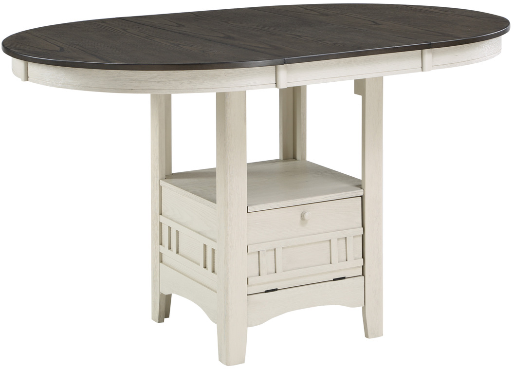 The Homelegance® Junipero Counter Height Table features a two-tone finish in antique white and rosy brown, a separate extension leaf, and a storage base with a door. The white finish over oak veneer serves to highlight the wood’s grain.Read More