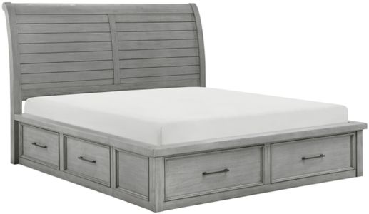 A total of 6 drawer units are located on the side rails and footboard of the queen size bed creating additional storage space within your bedroom. The sleigh headboard is paired with a platform footboard resulting in an unfettered design. Dark finished metal knob and pull hardware front each drawer creating a complementing accent to the drawer fronts.