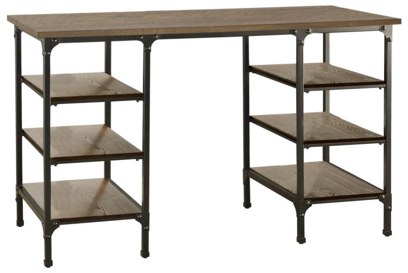 The decorative metal base and framing of the counter height writing desk paired with the casual contrast of the distressed ash veneer of the shelving and desk’s top create an industrial look for your office. 26-inch wide bookcase, 40-inch wide bookcase, desk and TV stand are also available.