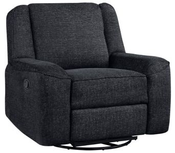 The swivel chair features a manually engaged reclining function, offering a maximized opportunity to stretch out. Ebony-hued chenille fabric upholstery covers the chair.
