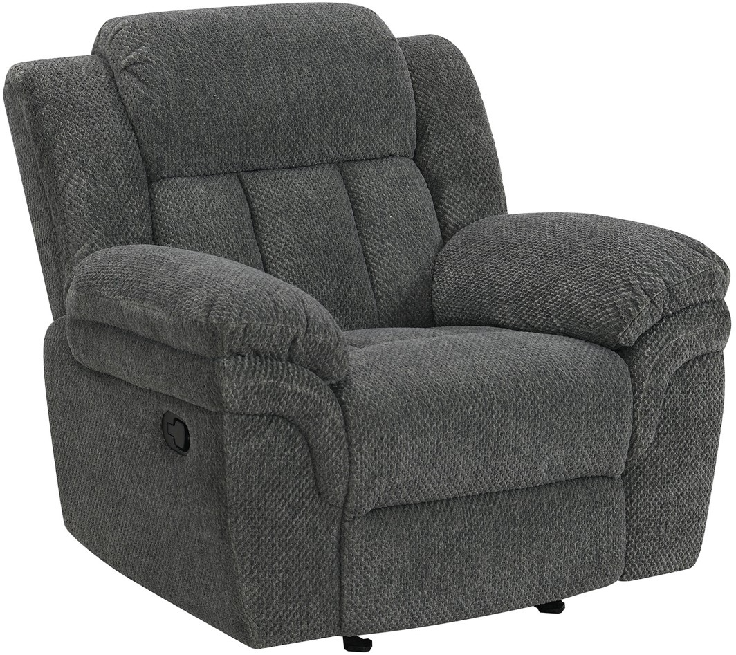 Unwind in style with this manual recliner. Wrapped in smooth gray fabric, this recliner offers smooth reclining and gliding movement. Enjoy more relaxing and comfortable experience with this furniture in style.Read More