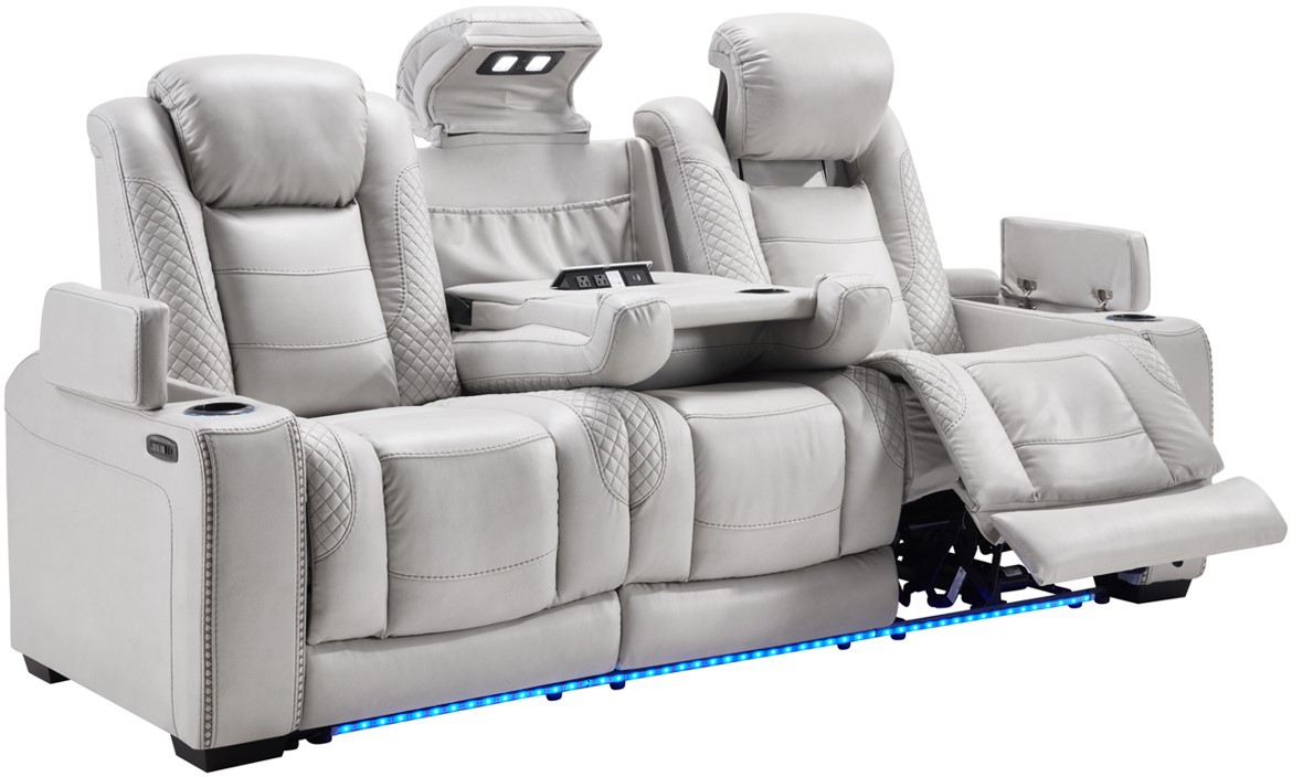 Take your living room to the next level with this Sofa. Outfitted in smooth Smoke faux leather, it features dual power recliners, power headrests, a drop-down center console with cupholders, power outlets, hidden storage, and LED lighting—blending luxury and tech for the ultimate lounging experience.Read More